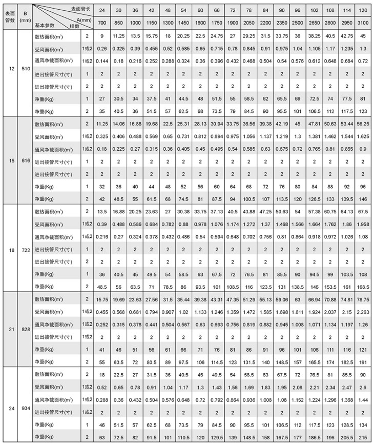 2.翅片管均用φ16x1.0mm紫铜管绕上10x0.2mm的紫铜带,呈螺旋状,翅片距有3.2mm(R)、4.2mm(M)、6.5mm(T)三种。R片距小而散热面积大具有最大的散热量;M种片距较大,散热量及空气阻力均较小;T种片距最大,适用于蒸汽压力较高而空气温升较低的情况。有各种不同表面管长,管数,排数及翅片片距的多种配合,计大小规格有七百六十五种。